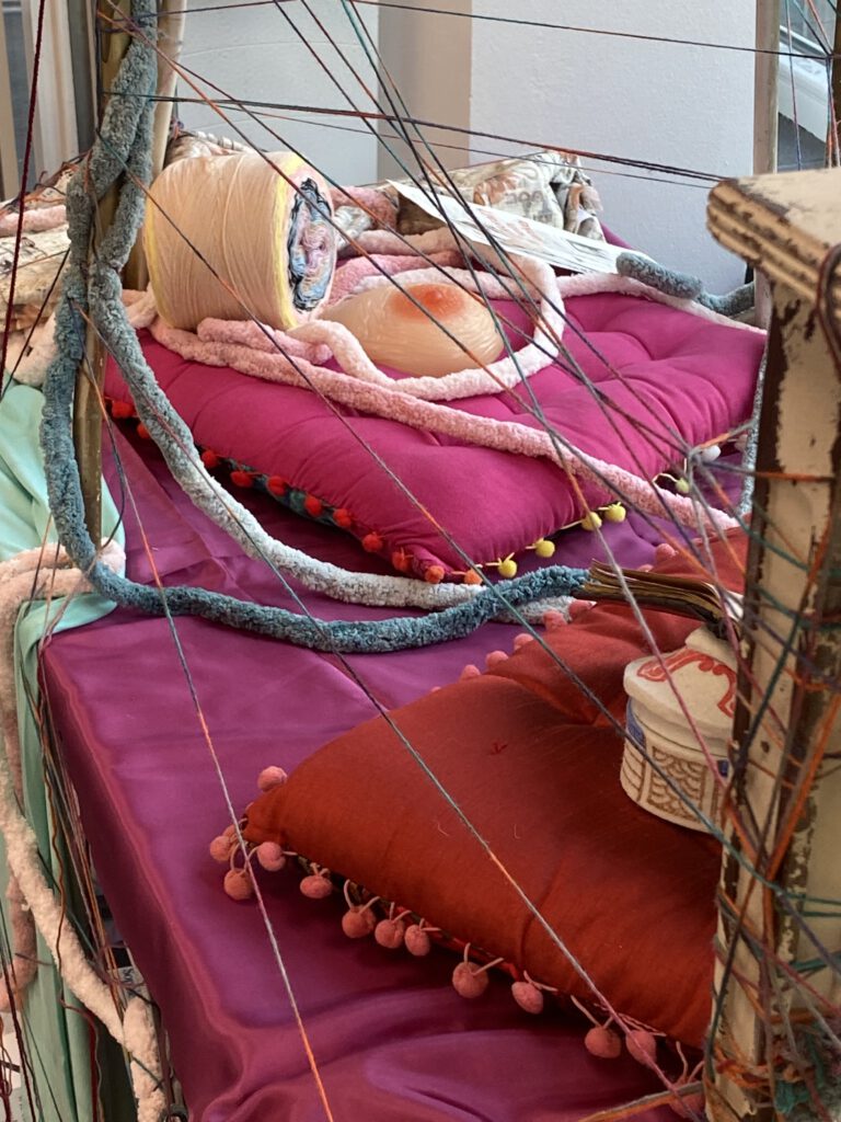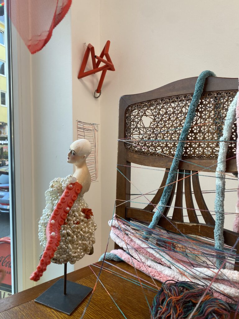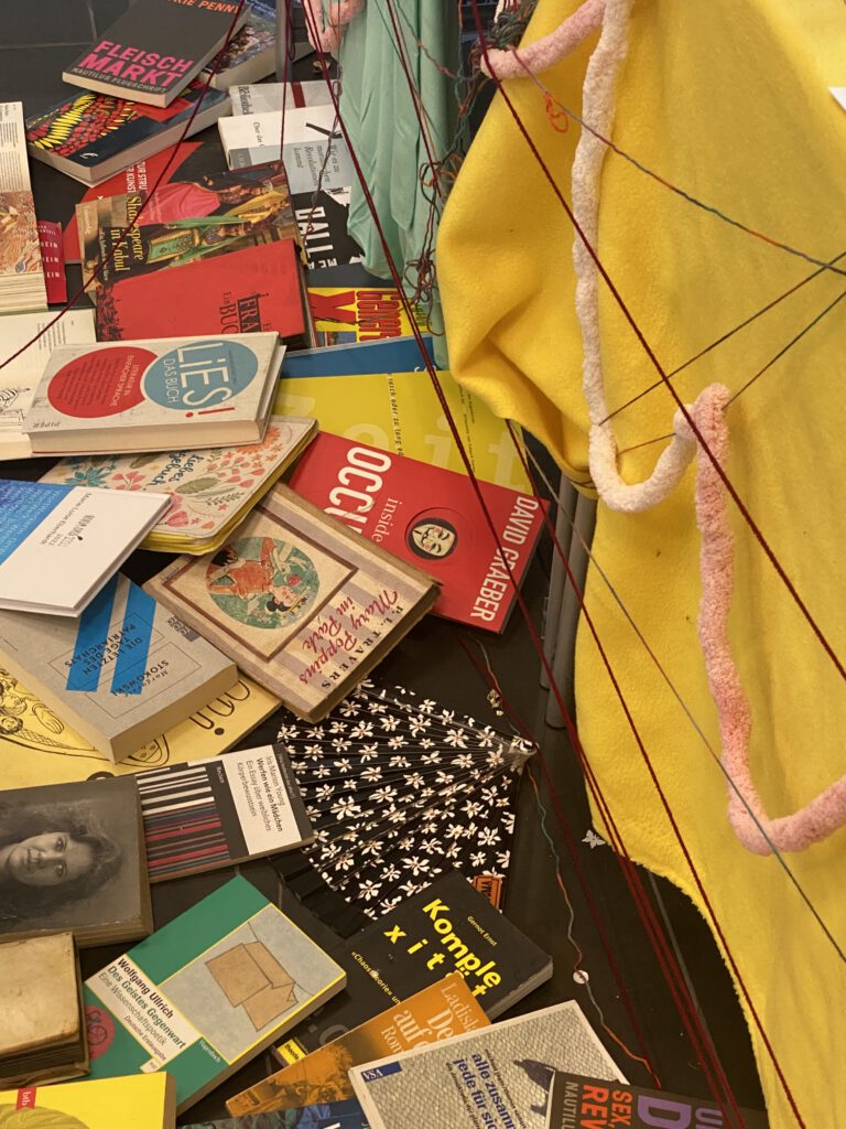 I interwove personal objects, books, images, ceramics, and furniture with colourful yarns – a poetic network of relations, thoughts, and materials.