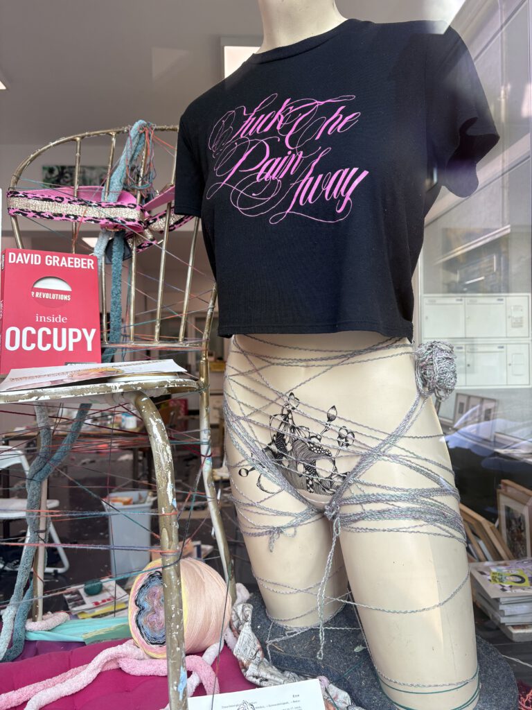 entrelacé objetos personales, libros, imágenes, cerámica y muebles con hilos de lana de colores, creando una red poética de relaciones, pensamientos y materiales.